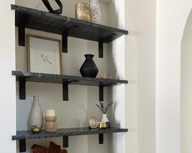 Our heavy-duty shelf brackets are perfect for marble, glass, or stone shelves. We've adjusted our popular metal L brackets by removing the drill holes on the top, making it easy for shelves to rest securely in place.