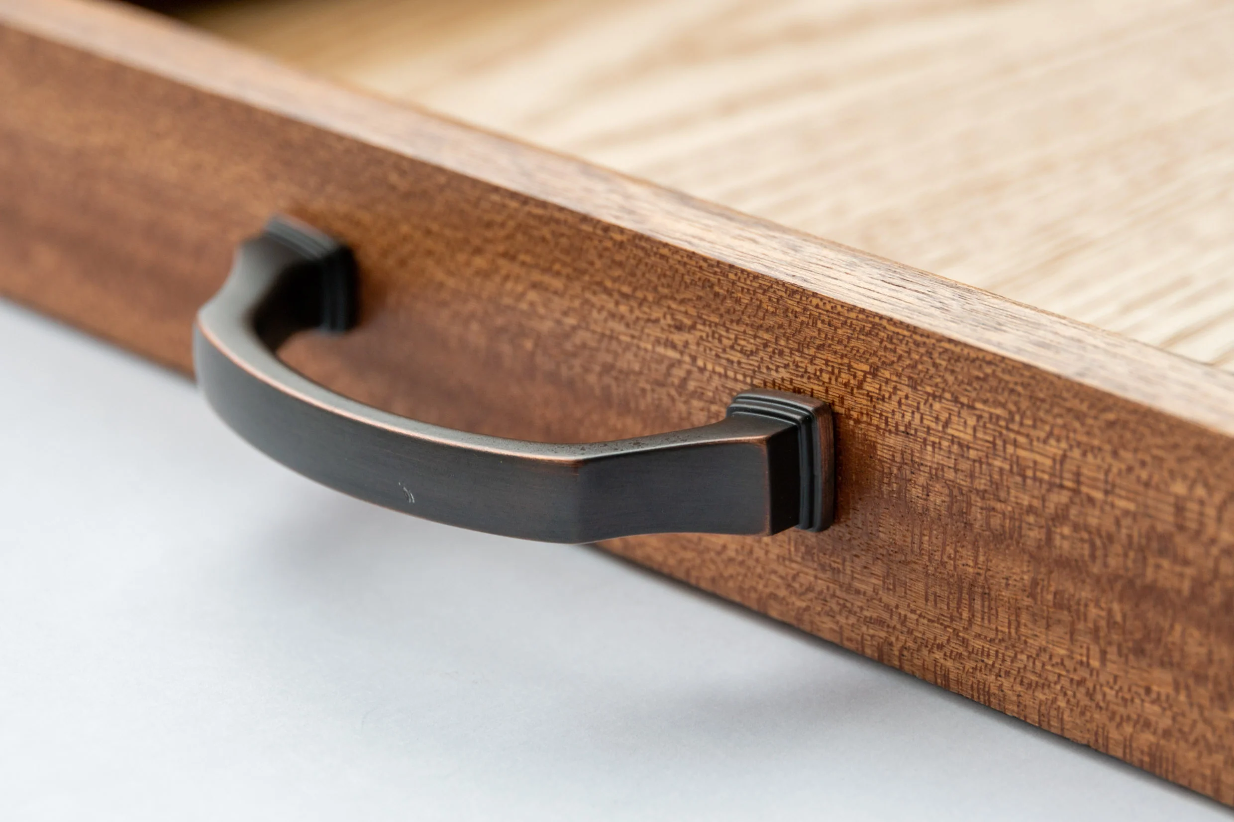 Our exquisitely crafted Luxury Serving Tray with Full Grain Leather effortlessly elevates your breakfasts in bed. Handmade in the heart of Brooklyn, New York, our master artisans have meticulously selected the highest quality mahogany and oak wood to create a tray that is both aesthetically stunning and functionally superior. The tray is designed with a sleek leather backing that provides a soft and supple surface for your delicate items, while the brushed brass handles add a touch of sophistication and style.
